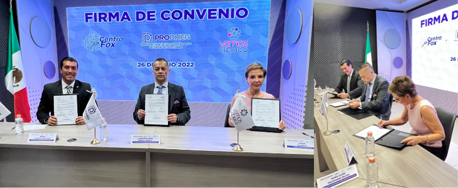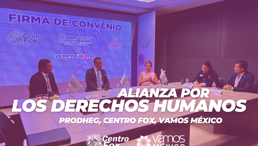 Martes 26 de julio, 2022. Se llevó a cabo la forma del acuerdo de Entendimiento PRODHEG, Centro Fox y Fundación Vamos México. La firma de este convenio tiene como OBJETO establecer las bases para que las instituciones firmantes realicen conjuntamente diversas actividades encaminadas al fortalecimiento del respeto, defensa y promoción de los derechos humanos, a través de distintas áreas de colaboración específicas como jornadas de difusión, desarrollo de seminarios, congresos, foros y cualquier otro tipo de evento cualquiera que sea su denominación, sobre temas específicos de interés común; la realización conjunta de investigaciones y estudios que puedan contribuir a la capacitación, así como la elaboración de todo tipo de material y documento que tenga como objeto la protección, defensa, promoción, estudio y divulgación de los derechos humanos.